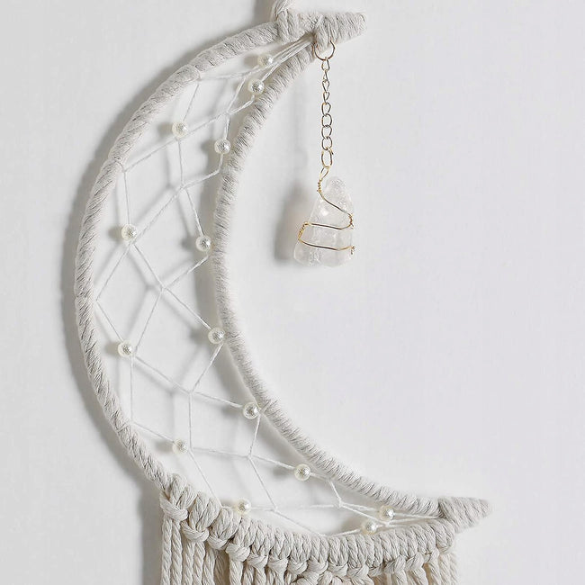 Ręcznie wykonany księżyc z makramy z dodatkiem prawdziwego minerału to wyjątkowa dekoracja w stylu boho, która łączy w sobie piękno rękodzieła z symboliką harmonii, wzrostu i pozytywnej energii. Delikatne sploty z naturalnej, kremowo-białej bawełny tworzą misterny wzór księżyca - symbol siły, ochrony i nowych początków. Zawieszony przy łóżku, w oknie lub na ścianie, łapacz snów pomaga tworzyć spokojną i przytulną atmosferę, sprzyjającą relaksowi oraz dobrym snom.
