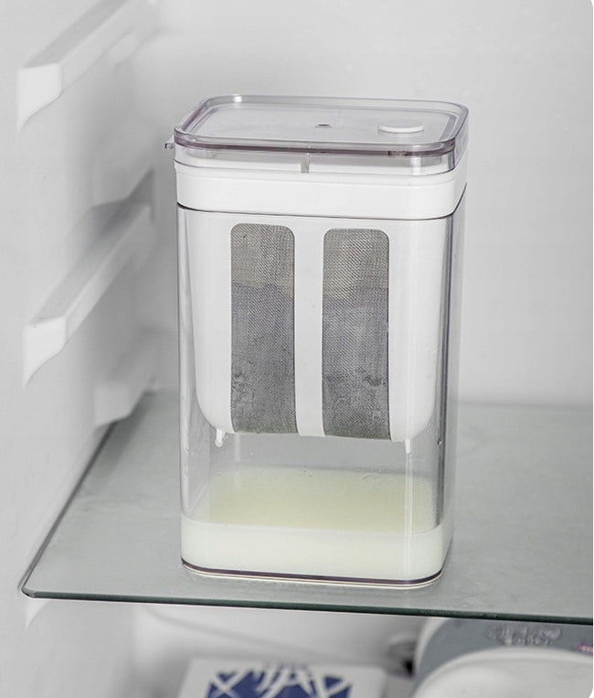 Przezroczysta pokrywka z silikonowym odpowietrznikiem chroni zawartość przed kurzem i nieprzyjemnymi zapachami, umożliwiając jednocześnie kontrolę procesu filtracji. Urządzenie ma pojemność 1100ml i może jednorazowo przefiltrować około 450ml jogurtu - wystarczy umieścić je w lodówce na 48 godzin, by uzyskać efekt gęstego, kremowego jogurtu greckiego.
