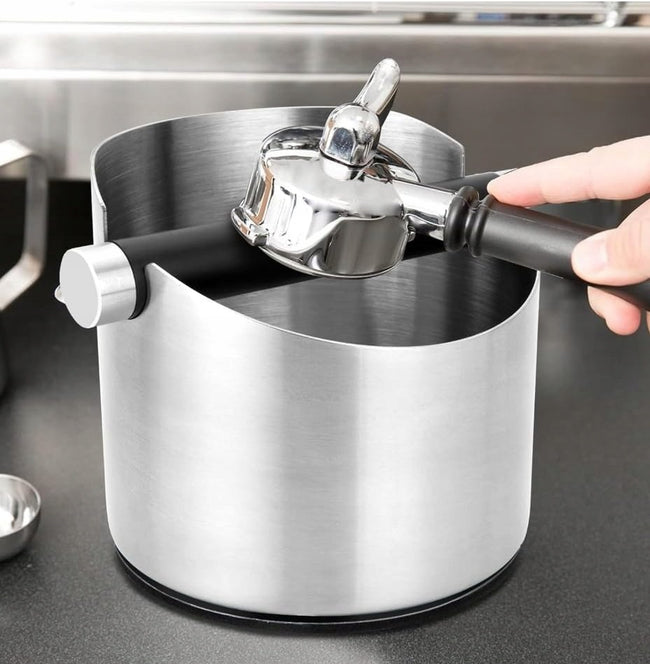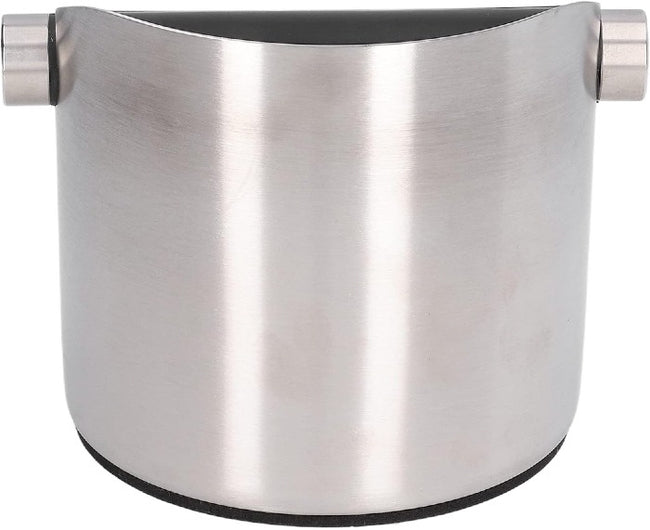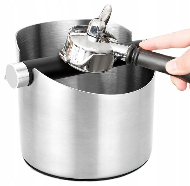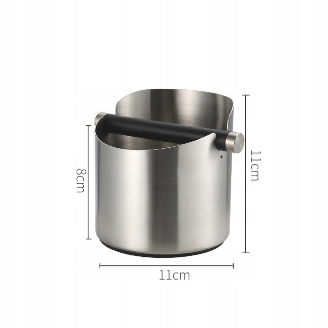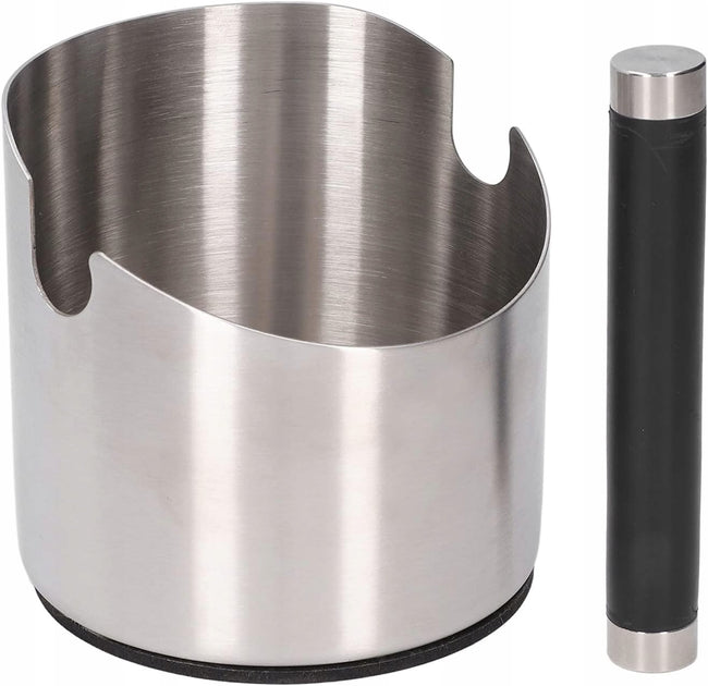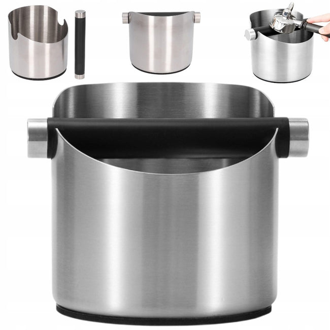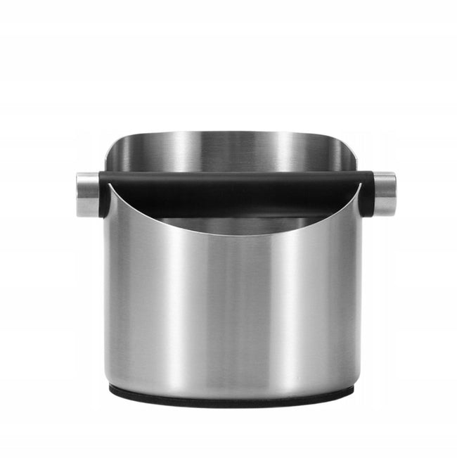 Knock box to niezbędne akcesorium dla każdego użytkownika ekspresu do kawy - zarówno w domu, jak i w profesjonalnych lokalach. Wykonany z połączenia stali nierdzewnej i gumy, łączy w sobie nowoczesny wygląd i maksymalną funkcjonalność. Dzięki solidnej, antypoślizgowej podstawie oraz amortyzującemu prętowi z gumy, pozwala na szybkie i wygodne opróżnianie portafiltra z fusów kawowych bez rozpryskiwania i hałasu. Ergonomiczna forma z dużym otworem i podwyższoną tylną ścianką zapobiega wyciekom i ułatwia czyszczenie - także w zmywarce. To niezawodne i trwałe rozwiązanie, które pozwala utrzymać miejsce parzenia kawy w czystości i porządku, a przy tym doskonale się prezentuje.