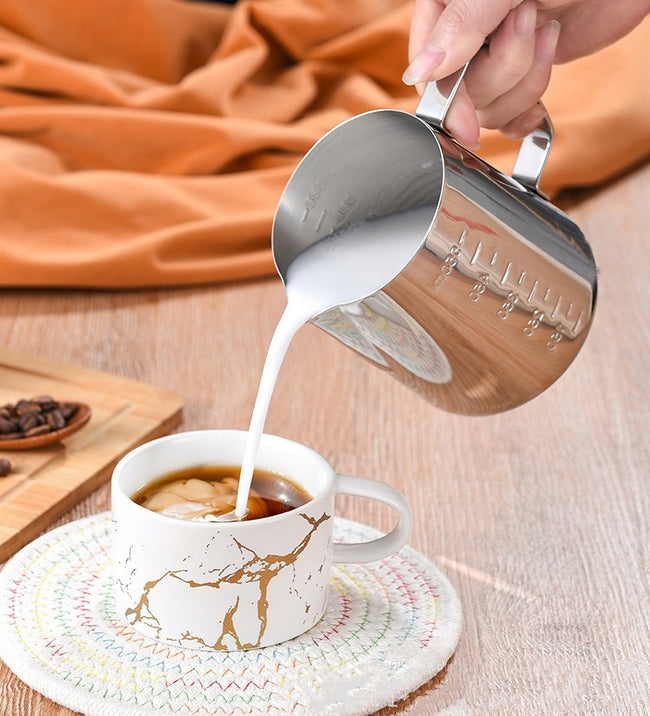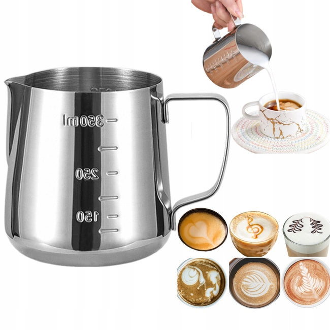 Dzbanek do mleka o pojemności 350ml to praktyczny i stylowy element wyposażenia każdej kuchni czy kawiarni. Wykonany z wysokiej jakości stali nierdzewnej w klasycznym srebrnym kolorze, jest trwały, odporny na uszkodzenia i łatwy w utrzymaniu czystości. Wewnątrz dzbanuszka znajduje się wytłoczona miarka co 50 ml, która umożliwia precyzyjne odmierzenie mleka lub śmietanki do kawy, herbaty lub innych napojów.