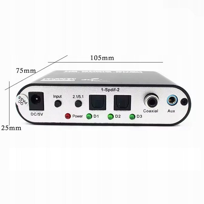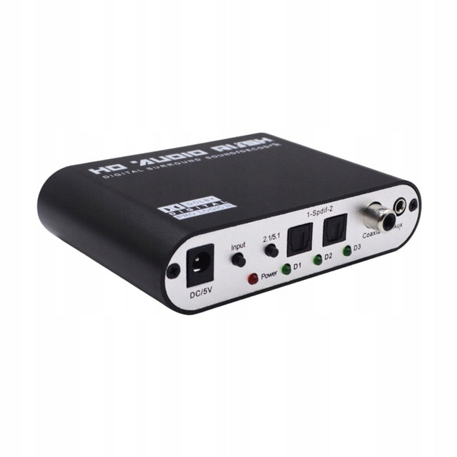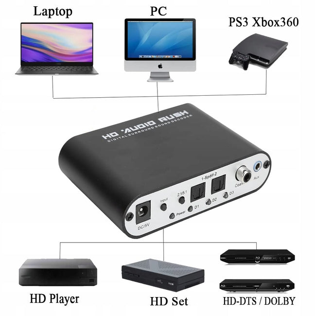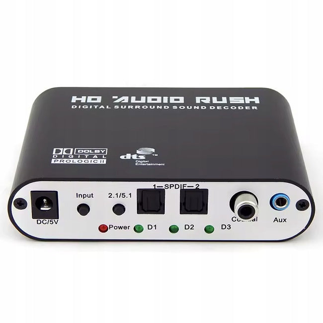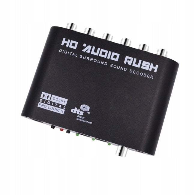 Konwerter DAC Audio HD 96kHz/24bit to funkcjonalne i nowoczesne urządzenie, które pozwala zamienić cyfrowy sygnał audio na analogowy, zapewniając wysoką jakość dźwięku i szeroką kompatybilność z różnymi źródłami. Dzięki obsłudze standardów DTS i Dolby oferuje realistyczne brzmienie przestrzenne 5.1, co sprawia, że idealnie nadaje się do kina domowego, nagłośnienia telewizora, konsoli czy odtwarzacza DVD.