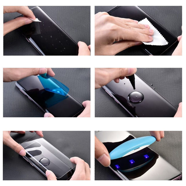 Szkło po przyklejeniu na powierzchni ekranu i pozbyciu się pęcherzyków powietrza (najczęstszy problemem poprzednich generacji) należy oświetlić lampą UV dołączaną do zestawu, aby przyspieszyć wiązanie się kleju.