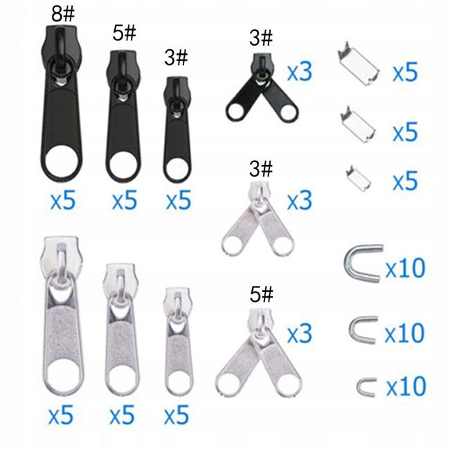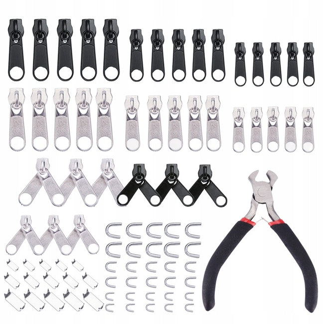 - Kompletny zestaw naprawczy - aż 85 elementów, w tym suwaki, stopery górne i dolne w różnych rozmiarach oraz specjalne szczypce do instalacji, które umożliwiają szybką i skuteczną naprawę większości zamków błyskawicznych